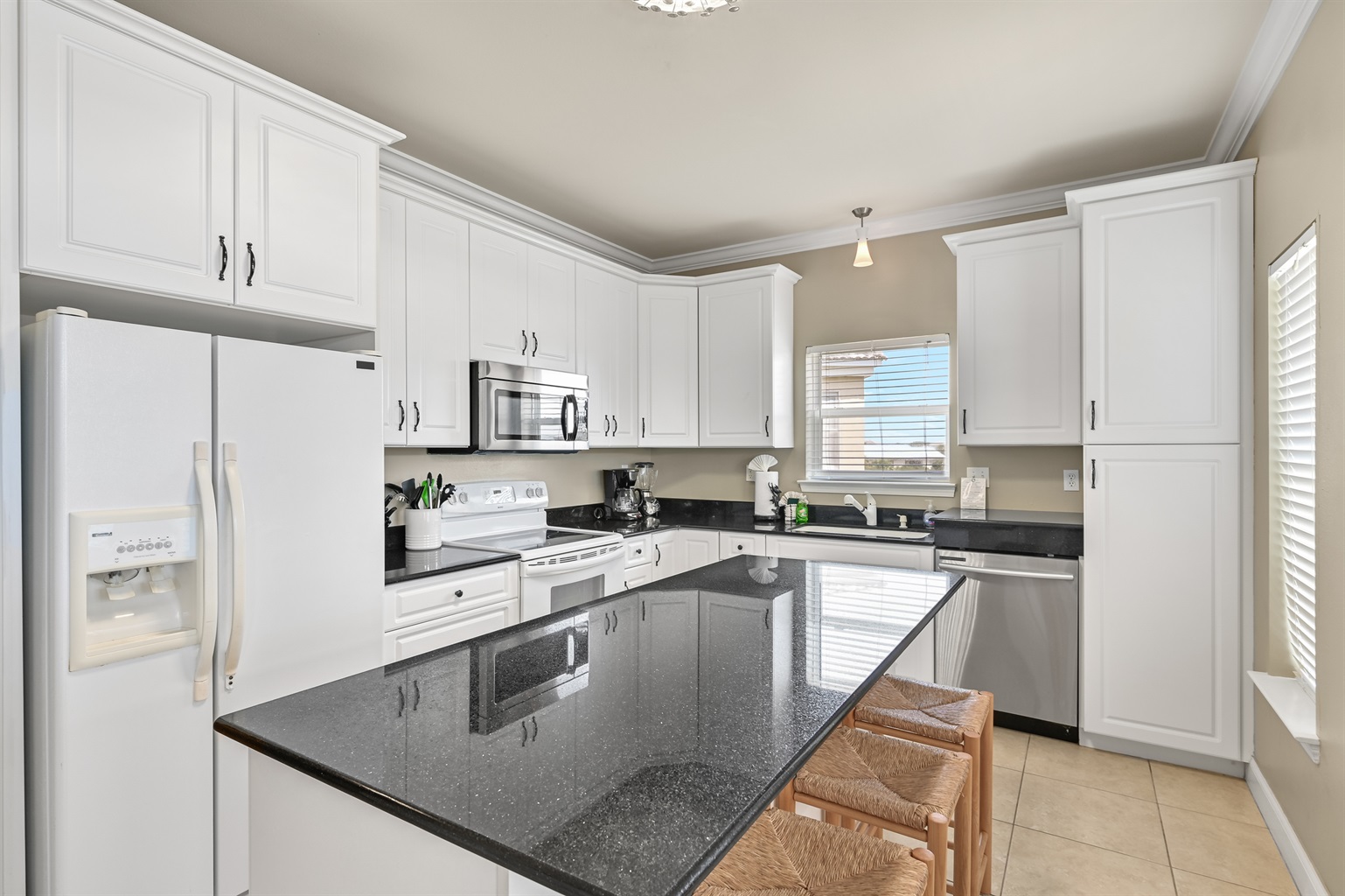 Full Kitchen #2 – Complete w/ stove/oven, refrigerator, microwave, dishwasher, coffee maker and more + island seating